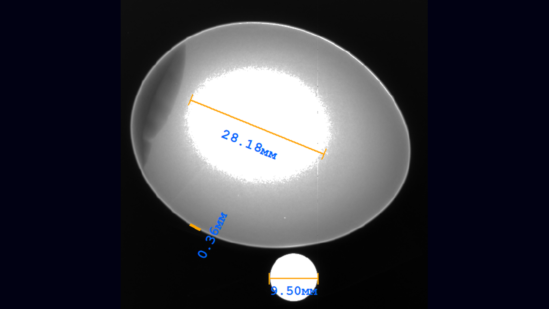 Как видно, измерить толщину скорлупы и оценить размеры желтка с использованием цифровой радиографии возможно. Толщина скорлупы составила от 0,32 до 0,4 мм.